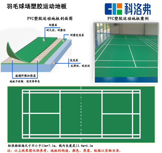 羽毛球運動的起源一說日本,一說英國。羽毛球地板國際比賽指定使用PVC塑膠運動地板,顏色為綠色,因為PVC塑膠運動地板的防滑性能、耐沖擊性能都好于其他地板,而且PVC塑膠運動地板的耐污性、耐磨性、環保性是其他地板無法比擬的,可以減緩運動員關節的沖擊,提供運動員的成績。所以PVC羽毛球專用地板好于實木羽毛球地板。因此,PVC塑膠運動地板是中高檔羽毛球場館的最佳選擇。 羽毛球運動地板板材規格通覽: 單卷寬1.42m/2.84