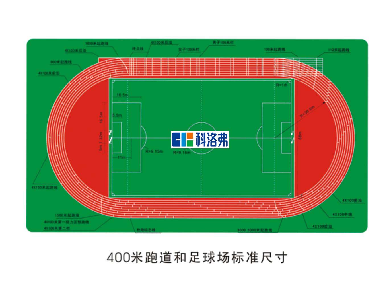 36、足球場人造草坪常用高度為50毫米,規格沒卷寬4米,人造草坪填料,目前一般有兩種,一種是石英砂,一種是黑色橡膠顆粒填充,高度為草高的70%即35毫米。37、 標準400米田徑場地,橢圓形跑道的彎道半徑應為36.5米(國際田聯標準),兩個半圓中心點距離為84.39米,這樣內圓長為398.12米,由內沿向外30厘米,測量場地長,應為400米。