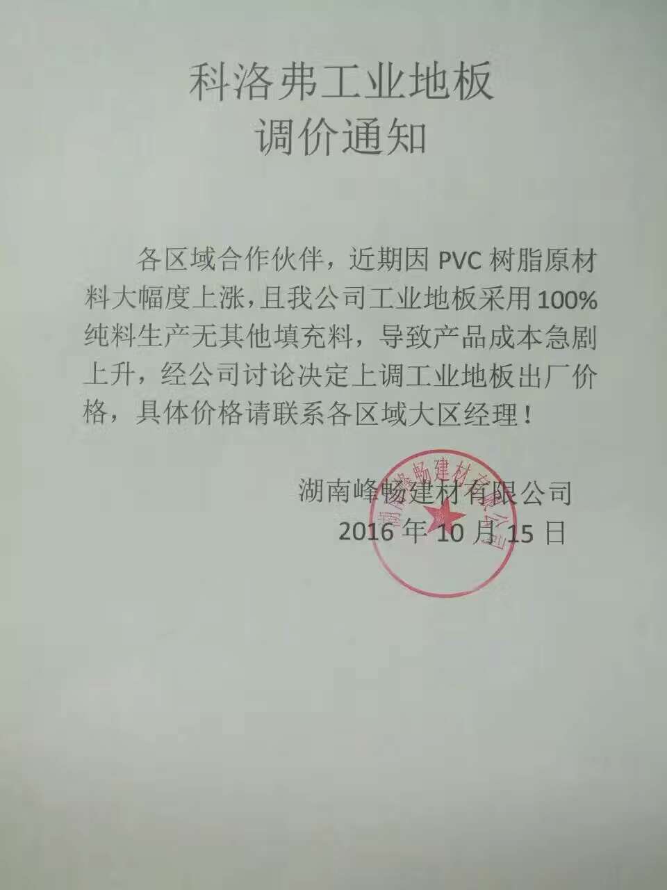各區(qū)域合作伙伴,近期因PVC樹脂原材料大幅度上漲,且我公司工業(yè)地板采用100%純料生產(chǎn)無其他填充料,導(dǎo)致產(chǎn)品成本急劇上升,經(jīng)公司討論決定上調(diào)工業(yè)地板出廠價(jià)格,具體價(jià)格請聯(lián)系各區(qū)域大區(qū)經(jīng)理!