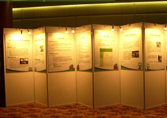 •   1、標準展板就是一種具有國際標準尺寸(990系列)的會議展板,起源于德國,現已在全球范圍內得到廣泛的使用。多樣化的零部件及其標準組合,猶如變形金剛能輕易組合成出人意料的空間造型,是現代展覽設計師的理想工具.利用鎖件連接,符合展會搭建時間短、 安裝快、式樣美的要求,其特點是裝卸快捷,便于運輸,節省存儲空間。2、標準尺寸:1mX2.5m(展板)、3mX3m(標準展位)。3、相關配件:八棱柱(大孔八棱柱,小孔八棱柱)、扁鋁(40 50 70扁鋁)、三卡鎖、書畫掛鉤、pvc貼白面展板、防火涂層貼面展板等。4、展板性能:由于八棱柱具有八角的性質,決定了標準展板的搭建形式多種多樣,W型、N型、T型、M型、Y型、H型、L型、U型等,因此具有廣泛的應用范圍。可以無限延伸,但不能將延伸的展板疊成一塊兒。         5、應用范圍:展覽展會、招商攤位搭建、招聘會布置、書畫展板搭建、學術會議展板制作、圖片攝影展板搭建、以及學生畢業作品展和博士生畢業論文高峰論壇等。(不適合在室外使用,如果需要在室外使和日麗的天氣,在沒有風的地方使用)