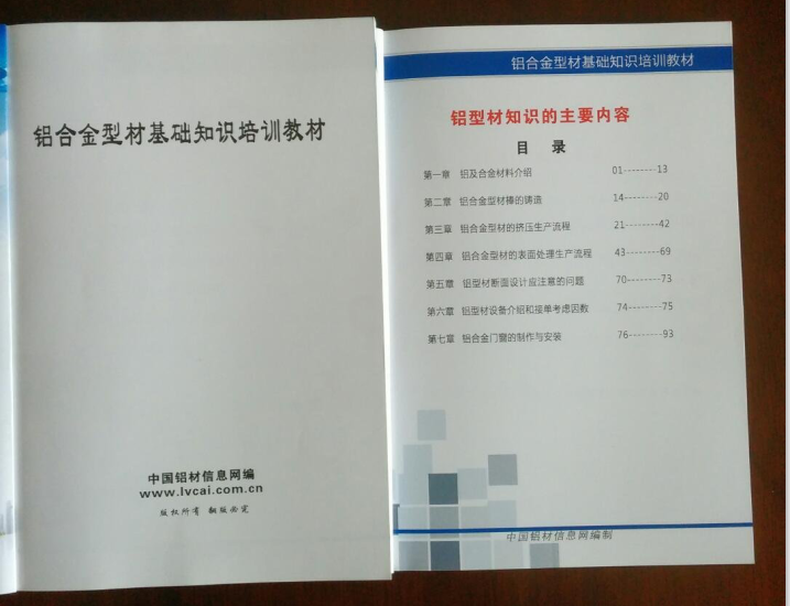《鋁合金型材基礎知識培訓教材》是由中國鋁材信息網(www.ylkoo.com)整理匯編,該教材相比以前版本對資料內容進行了優(yōu)選、充實,圖書采用的是精裝32K銅版紙彩色印刷,該教材共分七大章,內容涵蓋:鋁及合金材料介紹、鋁合金型材棒的鑄造、 鋁合金型材的擠壓生產流程、鋁合金型材的表面處理生產流程、 鋁合金型材斷面設計應注意的問題、鋁型材設備介紹和接單考慮因數 、鋁合金門窗制作與安裝等。教材圖文并茂,通俗易懂,適合各年齡、學歷層次人群閱讀。歡迎廣大鋁合金型材從業(yè)者與中國鋁材信息網進行交流和學習(網站微信號zglcxxw)。此教材售價為100元(含郵費),團購50本以上打8折。聯(lián)系電話:0714-8765286。