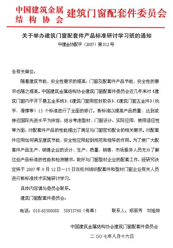 舉辦建筑門(mén)窗配套件產(chǎn)品標(biāo)準(zhǔn)研討學(xué)習(xí)班通知